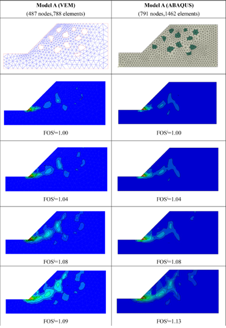 鉴于此,针对土石混合体边坡岩土材料不均匀和不连续等特点,武汉岩土所科研人员基于增量法弹塑性力学原理和双线性投影算子,结合强度折减法和不等式,提出了土石混合体边坡稳定性分析的虚单元强度折减技术,求解了不同强度折减系数系下土石混合体边坡的渐进破坏特征,并讨论了方法的网格依赖性问题。由于岩石与土的物理力学性质不同,应力集中在岩石与土的接触区,塑性区围绕在岩石周围(如图),在塑性区很难形成规则的连通区域。