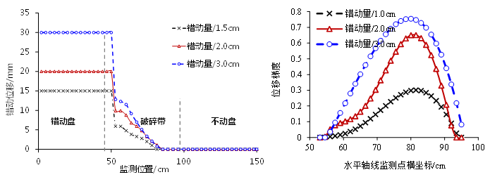 (2)提出了一套适用于深埋条件活断层蠕滑错动模拟的试验方法,通过试验辨识出不同地应力条件和断层地质结构下断层错动位移分布模式,如图3所示,揭示了不同条件下断层不同部位的位移分配比例特征及破碎带内位移梯度变化规律,提出了基于位移梯度的断错风险指标,实现了活断层区域围岩与结构断错风险的准确评价;