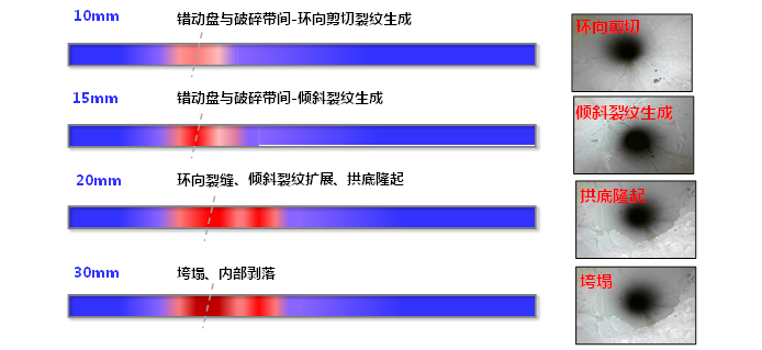 (3)基于大型模型试验成果,揭示了隧道结构对断层位移分布特征的影响和断错过程中隧道结构的响应规律,辨识出了断错过程中衬砌破坏演化规律、破坏形态、位置及范围,如图4所示,验证了位移分布模式和梯度作为结构破坏程度评价和结构参数设计依据的科学性。