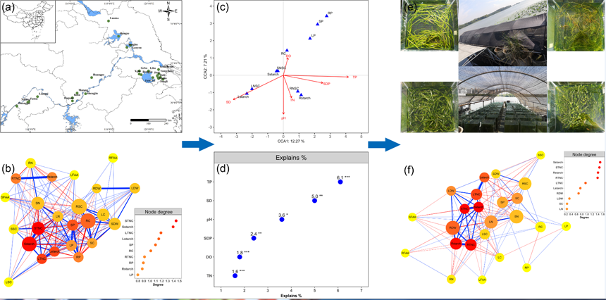 图1 基于野外调查和控制试验的植物性状网络图以及野外调查植物性状网络中的中枢性状和环境因子之间的关系。(a)长江流域26个湖泊位置;(b)基于野外调查的26个湖泊所构建的植物性状网络;(c)典范对应分析(CCA)的前向选择过程探索影响野外调查植物性状网络中枢性状变异的显著环境因子;(d)六个显著环境因子的独立贡献率;(e)基于以上三个显著环境因子(水体总磷(TP)、透明度(SD)和底泥总磷(SDP))的控制实验;(f)基于控制实验所构建的植物性状网络。图1b和1f的插图表示植物性状网络中十个拥有最高的“度(degree)”的中枢性状,性状拥有较高的“度”意味着该性状与其他性状联系密切。节点颜色从黄到红表示逐渐增高的“度”。