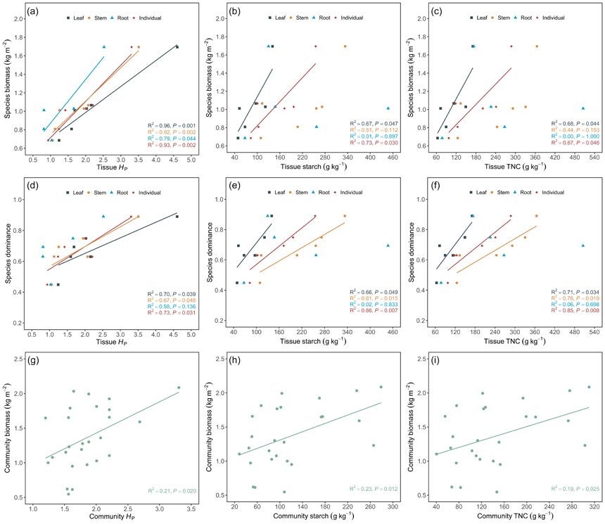 图2 磷化学计量内稳性(HP)、淀粉(starch)、总非结构性碳水化合物(TNC)与物种生物量(a-c)和优势度(d-f)以及群落生物量(g-i)之间的关系。