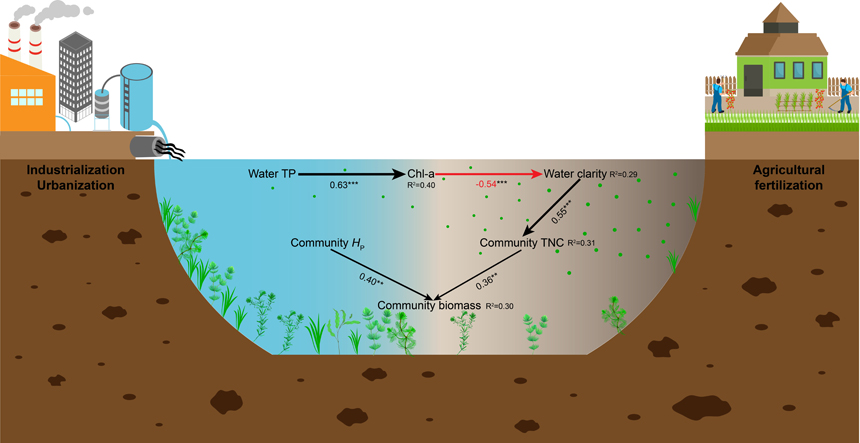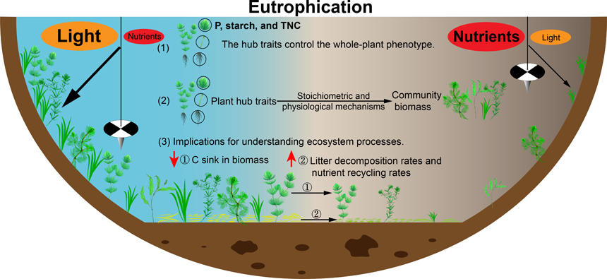 水体富营养化引起的营养富集和水下光照可利用性减少显著影响了水生生态系统的结构和功能。这些环境压力导致浅水湖泊发生稳态转换,因此探索影响淡水生态系统结构和功能的机制就显得尤为重要。富营养化通过改变水体光和营养的可利用性强烈影响了沉水植物的功能性状,如化学计量特征和生理状态。然而,目前仍然不清楚连接沉水植物功能性状和生态系统结构和功能的机制,以及这些机制如何引起沉水植物的衰退。