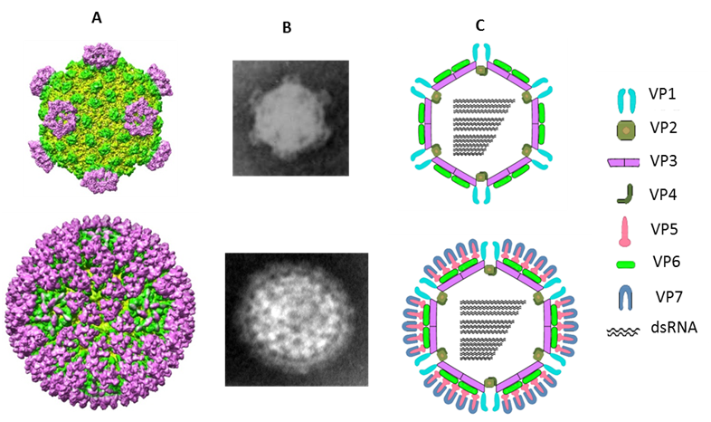 图1. 水生呼肠孤病毒核心(上)与完整颗粒(下);低温电镜与三维重构影像(A),负染电镜影像(B),病毒颗粒组成模式图(C)。