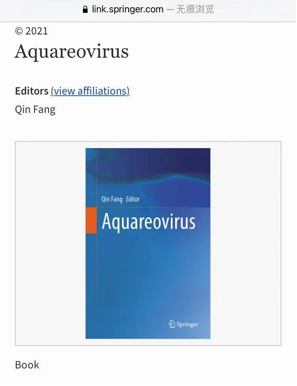 近日,中国科学院武汉病毒研究所方勤研究员主编的“Aquareovirus”(《水生呼肠孤病毒》-全英文版)/“水生呼肠孤病毒”一书,由Springer Nature出版集团正式在线出版(https://link.springer.com/book/10.1007/978-981-16-1903-8)。该书全面系统阐释了水生呼肠孤病毒的发现与研究概况,包括病毒结构与基因编码蛋白功能、感染与复制、流行病学与诊断、疫苗与药物防控及宿主抗病毒免疫应答等40年的研究进展。