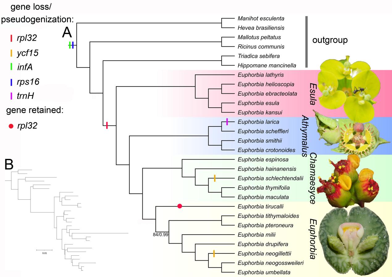 图1. 基于76个质体编码区重建的大戟属系统发育树(展示基因的丢失/假基因化)