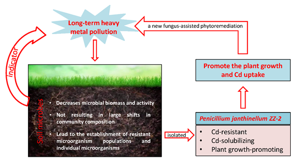 武汉植物园草坪草与牧草分子育种学科组科研人员通过对湖南株洲清水塘工业区镉污染土壤微生物多样性进行研究,发现长期镉污染显著降低了土壤细菌和真菌的群落多样性及生物量,但微生物群落结构影响并不大。长期镉污染还会导致Pseudonocardiaceae、AD3、Latescibacteria等特定微生物群落的出现。进一步对镉污染土壤中耐镉微生物进行筛选,获得一株可以耐300mg/L镉浓度的真菌ZZ-2。通过外源添加试验发现,ZZ-2可显著提高狗牙根耐镉能力,但同时也能增强狗牙根对镉的向上转运能力。表明ZZ-2在镉污染土壤修复中应用潜力巨大。16s rRNA序列分析结果表明,ZZ-2为微紫青霉(Penicillium janthinellum),ZZ-2可通过分泌激素(IAA)和菌丝吸附镉降低其对狗牙根的毒害。研究结果为植物-微生物联合修复镉污染土壤提供材料和理论依据。