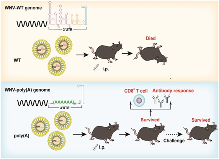 图1. WNV-poly(A)减毒活疫苗的构建及应用