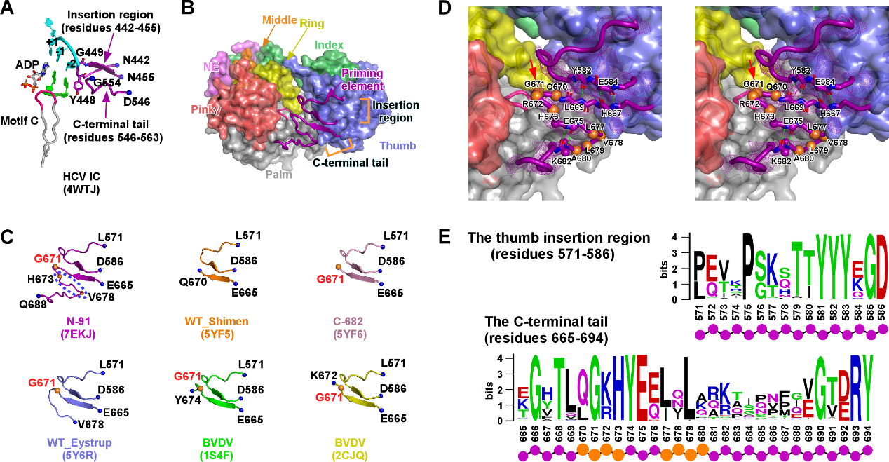 图1 CSFV RdRP晶体结构展示了较为完整的引发元件。A)HCV RdRP引发复合物的晶体结构。B)CSFV RdRP的整体结构。其中引发元件为紫红色。C)瘟病毒属 RdRP引发元件结构对比。D)CSFV RdRP引发元件及其周围区域的立体对像图。E)瘟病毒属RdRP引发元件氨基酸序列保守性分析。