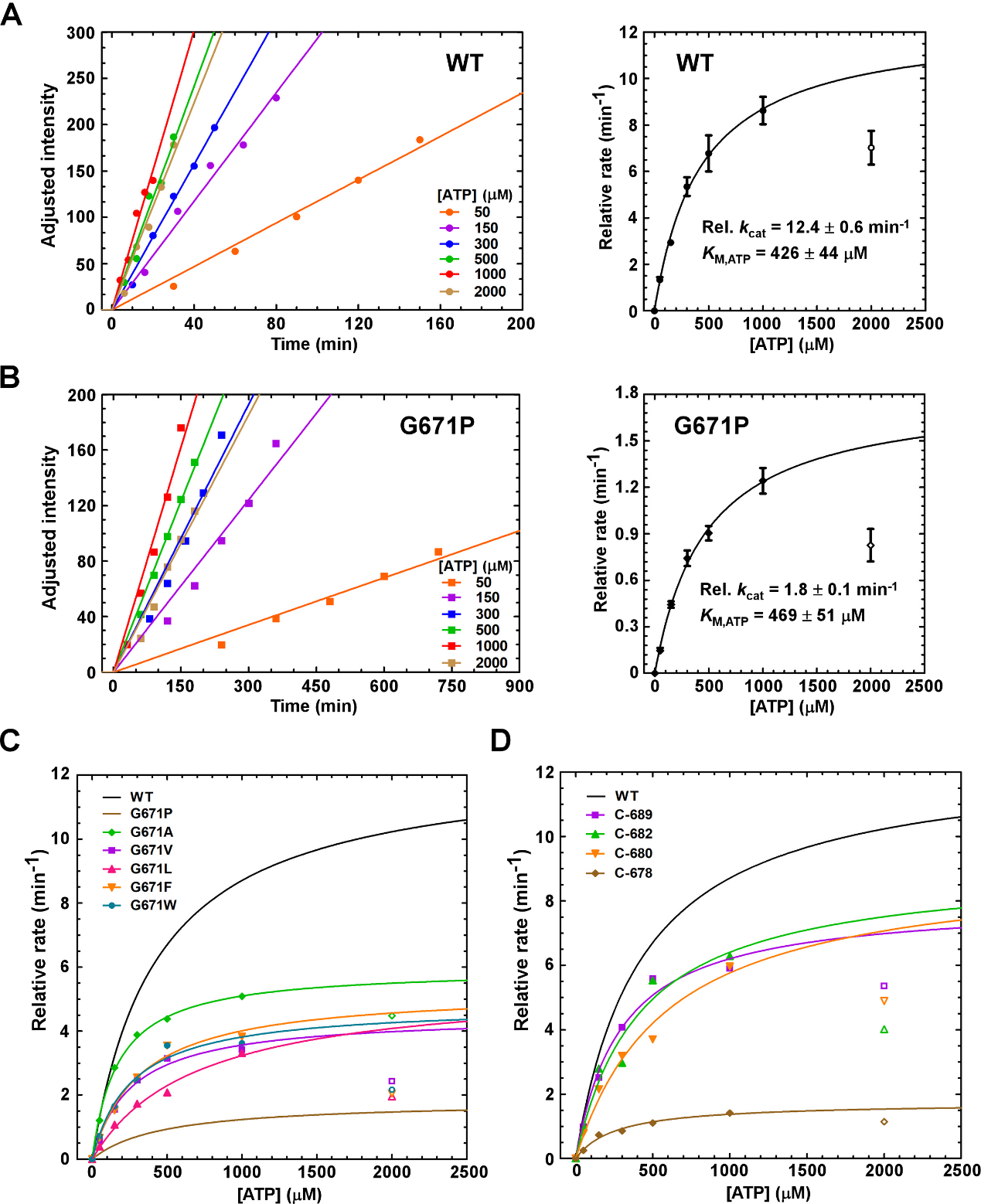 图2 CSFV RdRP及其突变体的酶学表征。A-B)WT(A)和G671P突变体(B)的单步引发反应动力学分析。C-D)G671位点其它突变体(C)和C端截短体(D)的引发反应动力学分析。其中WT和G671P的米氏方程拟合曲线分别取自A和B。