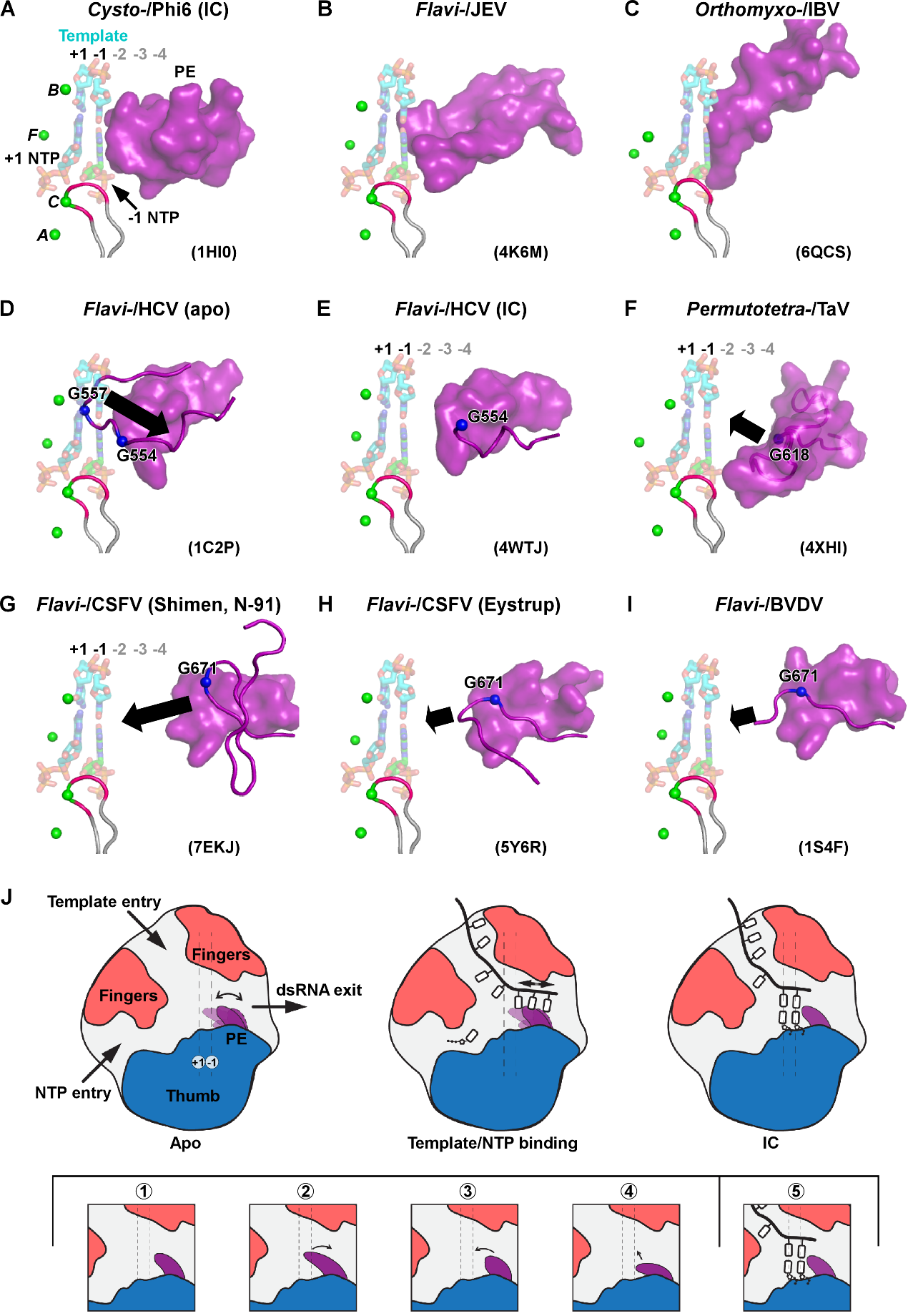 图3 RdRP 引发元件的结构比较提示RdRP从头合成可能具有普适性的诱导契合机制。A-I)代表性病毒 RdRP引发元件的比较。J)从头合成型RdRP引发时的诱导契合模型。当RdRP处于非底物结合状态时,引发元件可具有多种构象(左上图和下图 1-4),而RdRP结合模板RNA和NTP后,引发元件可经历构象变化后到达RNA模板的末端,同时稳定参与引发反应的NTP,实现精准高效引发。下图中的箭头表示引发元件达到其引发状态所需构象变化的方向。