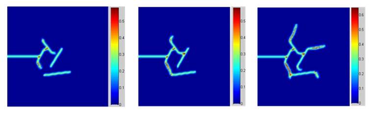 针对传统数值方法(有限元(FEM)、扩展有限元(XFEM)、边界元(BEM)和非连续位移法(DDM))模拟水力压裂缝网形成过程中遇到的难题,中国科学院武汉岩土力学研究所杨典森研究员带领团队提出了一种基于近场动力学(PD)的水力压裂耦合模型,解决了裂缝面追踪、流体压力施加、剪切破坏判断、摩擦-接触本构构建和缝网间连通关系判断等关键问题。基于近场动力学(PD)非局部思想,该模型可以方便地模拟裂缝网络的生成、扩展、连通和相互作用过程。并通过将模拟结果与解析解和试验结果进行对比,验证了模型的准确性(图1、图2)。最后,利用该模型揭示了含任意复杂裂缝网络岩体水力压裂裂缝网络的生成与连通过程(图3)。