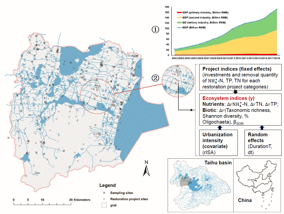 由于快速的经济发展和城市化等人类活动持续加剧自然生态系统的破坏和生物多样性的丧失,为了解决经济发展和生态环境破坏之间的矛盾,生态治理/恢复工程已在很多国家得到较高程度的重视和推广。然而,经济发展一定要以生态环境破坏为代价吗?人类社会经济发展和自然生态如何取得平衡呢?为了回答这些疑问,水生所的研究人员选取宜兴市作为典型区域,通过收集2007-2017年宜兴市实施和维护的水生态治理工程相关信息、土地利用数据及野外采样调查的水质、底栖动物数据,研究了城市化进程、不同类型水生态治理工程、水质和底栖动物多样性三者之间的量化相互作用关系(图1)。