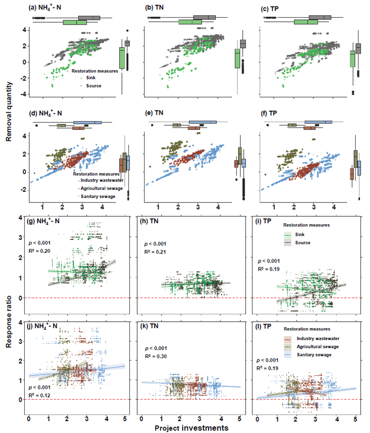 图2 不同类型治理工程投资量和根据具体工程量计算所得的营养盐去除量之间的关系(a-f),箱线图显示投资量和污染物去除量的分布;不同水质指标对不同类型水生态治理工程的响应关系(g-l)。投资的原始单位是105元,营养盐去除量的原始单位是104 t/a,这里均用log10进行了转换。