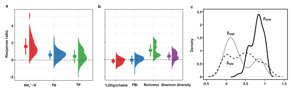 图3 营养盐(-ln(2017/2007))及底栖动物群落相关指数(ln(2017/2007))的响应系数(a,b);底栖动物2007和2017年β多样性相异指数(βSOR)、周转(βSIM)和嵌套部分(βSNE)分布图(c)。