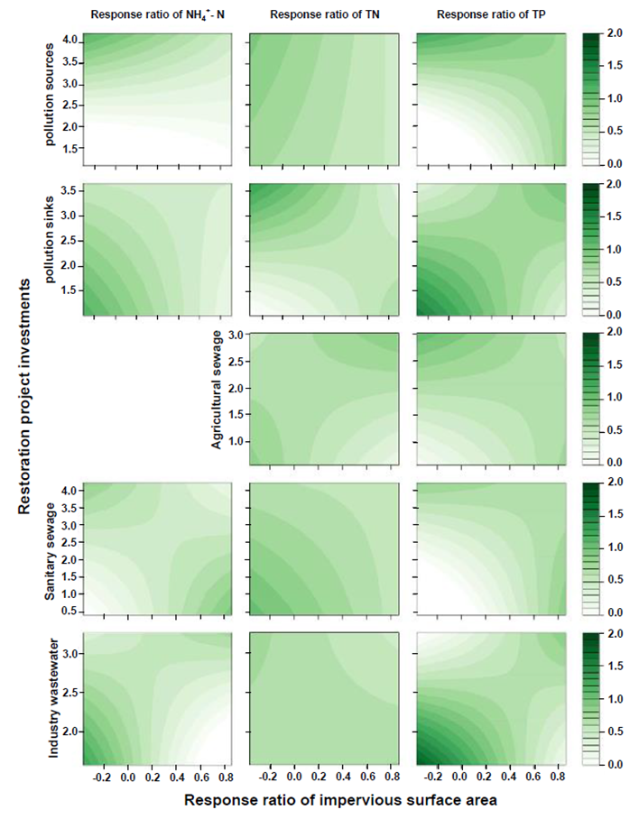 图4 不透水表面积指数、不同类型工程投资量和营养盐降低速率之间的相互作用关系。投资单位105元,营养盐去除量的原始单位104 t/a,log10转换。