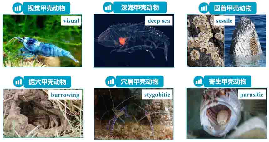 甲壳动物,顾名思义是一类身披几丁质外壳(甲壳)的动物,它隶属于节肢动物门(Arthropoda)、甲壳亚门(Crustacea)。甲壳动物的生活环境和生态习性多样化,可大致划分为以下6类:①视觉(visual)甲壳动物,生活在光线好的水域,靠视觉捕获猎物,或者躲避捕食者的追杀;②深海(deep sea)甲壳动物,生活在200-11000m等光线较差水域;③固着(sessile)甲壳动物,终身附着于岩石上或生物有机体体表的,如藤壶;④掘穴(burrowing)甲壳动物,会自己挖洞越冬,或者躲避天敌,如克氏原鳌虾(小龙虾);⑤穴居(stygobitic)甲壳动物,栖息于天然洞穴;⑥寄生(parasitic)甲壳动物,寄生于鱼类的体表、腮、口腔或胸腔中。其中有一类寄生于口腔的缩头水虱,其寄生行为非常特别,它在幼虫时进入鱼类的口腔内,吸食鱼舌的血液,直到鱼的舌头萎缩,然后将自己的尾部与已经萎缩的鱼舌连接起来代替鱼舌工作(图1)。
