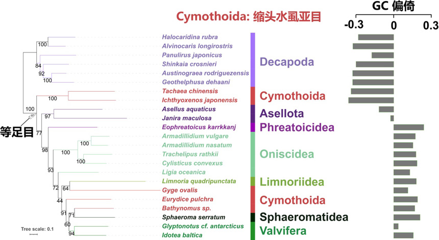 图2. 基于线粒体基因组的等足目系统发育及其GC偏倚