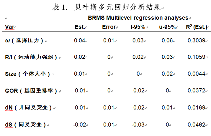 在对GC偏倚的比较分析过程中,张东、Ivan Jakovlic等人(Jakovlic et al., 2021)还发现不同生态习性甲壳动物的GC偏倚呈现不同的特点,视觉甲壳动物的GC偏倚程度较低,而其它甲壳动物的GC偏倚程度较高(固着甲壳动物除外)。视觉甲壳动物的运动能力强、代谢率高,而其它甲壳动物的运动能力弱、代谢率低。运动能力与其受到的选择压力(自然选择)强弱成正比,因此与线粒体基因组的GC偏倚程度成反比;而代谢率与碱基突变压(中性突变)的强弱成正比,因此与GC偏倚程度成正比。甲壳动物的GC偏倚趋势证明,作用于运动能力的选择压力可能是主导它们线粒体基因组进化的主要动力。该假说得到了多种统计分析结果的支持(表1)。