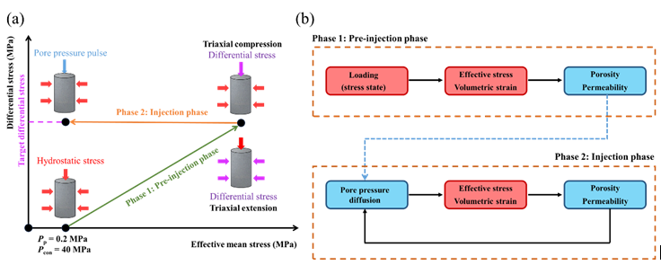 将流体注入到地下是许多能源工程中不可或缺的一项重要操作,例如二氧化碳地质利用与封存、非常规储层压裂开采、地下储能、地热开采等。流体与岩石的相互作用涉及复杂的水力耦合过程,在提高目标储层渗透率的同时,也存在着激活附近隐伏断层进而诱发有感地震的潜在风险。地应力的相对大小和方向是影响岩石水力耦合行为的重要因素,充分理解不同地应力状态下流体注入岩石引起的水力耦合响应对于工业活动的高效、安全运行十分关键。相关领域科研人员在室内开展了大量的岩石注水实验,主要集中于静水压力和三轴压缩应力状态下岩石的强度弱化及破裂行为,但对于岩石在不同应力状态,特别是三轴拉伸应力状态下渗透率演化规律及剪切失效潜力的对比研究关注较少,这与目前实验技术的局限性有关。