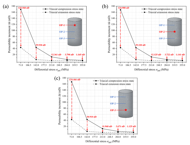 图2 三轴压缩和拉伸应力状态下不同位置处岩石渗透率增量随差应力变化的趋势:(a)观察点OP-1; (b)观察点OP-2; (c)观察点OP-3。