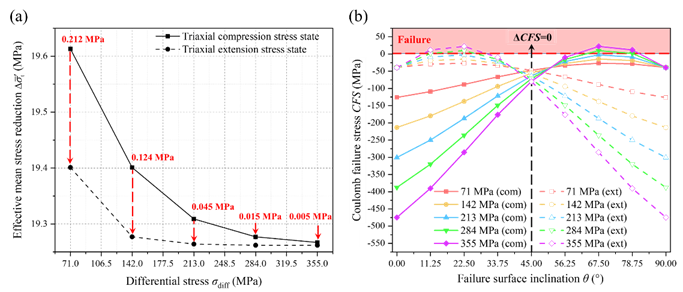 图3 (a)三轴压缩和拉伸应力状态下岩石平均有效应力减小量随差应力变化的趋势;(b)三轴压缩和拉伸应力状态下岩石库仑破坏应力随倾角变化的趋势。
