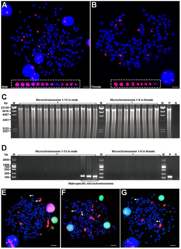 在前期基础上,该团队研究者筛选到银鲫最大量扩增的重复序列,该重复序列能够通过染色体荧光原位杂交特异性标记微小染色体;以该重复序列为探针,结合染色体荧光原位杂交以及染色体显微切割技术,构建了单染色体荧光显微切割平台,并成功分离了雌性9条微小染色体和雄性13条微小染色体;对分离的微小染色体分别进行多重置换扩增,利用雄性特异引物对扩增产物进行PCR筛选,最终鉴定出3条雄性特异微小染色体(图1)。进一步对雄性特异微小染色体进行基因组解析,发现雄性特异微小染色体含有常染色体同源序列和大量重复元件;通过与基因组和性腺转录组联合分析,筛选到一些具有转录活性的潜在雄性特异基因,其中9个基因在性别决定时期的性腺中展示出雄性特异或者雄性偏向表达。