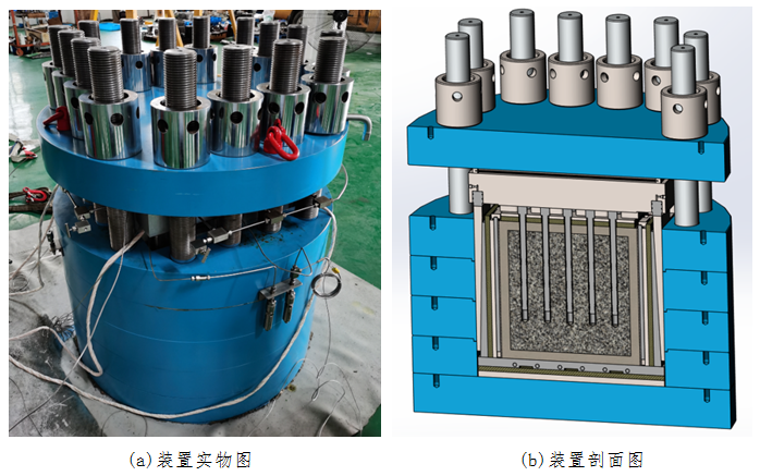 基于上述需求,中国科学院武汉岩土力学研究所白冰研究员、雷宏武博士、崔银祥副研究员研制了“干热岩/EGS”深部地热模型试验平台。设备最高温度为300℃,轴向最大出力超过1000吨,侧向可采用主动式加载,也可采用自主提出的变刚度被动式加载从而省去侧向加载系统。设备最大试样尺寸为450mm×450mm×450mm并具有一定的尺寸调节空间。设备主要用于开展干热岩/EGS地热提取、流动换热、水力压裂等的模型试验,也可用于模拟CO2地质封存、能源开发等领域相关定制试验。