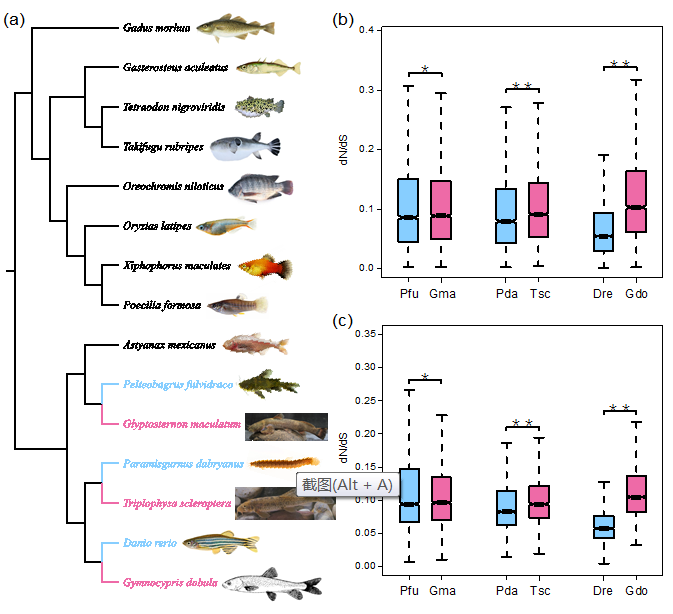 图1. 高原鱼类进化速率显著加快(Pfu, Pe. fulvidraco; Gma, Gl. maculatum; Pda, P. dabryanus; Tsc, T. scleroptera; Dre, D. rerio; Gdo, Gy. dobula)