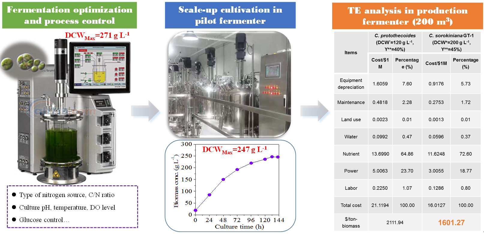 中国科学院水生生物研究所研究人员以一株可异养培养的小球藻为研究对象,通过实施一系列的发酵优化和有效的过程控制,实现了该藻的异养超高密度培养。在实验室和中试发酵罐放大条件下,小球藻最高细胞干重分别达到271 g/L和247 g/L,为目前报道的最高小球藻生物量浓度。
