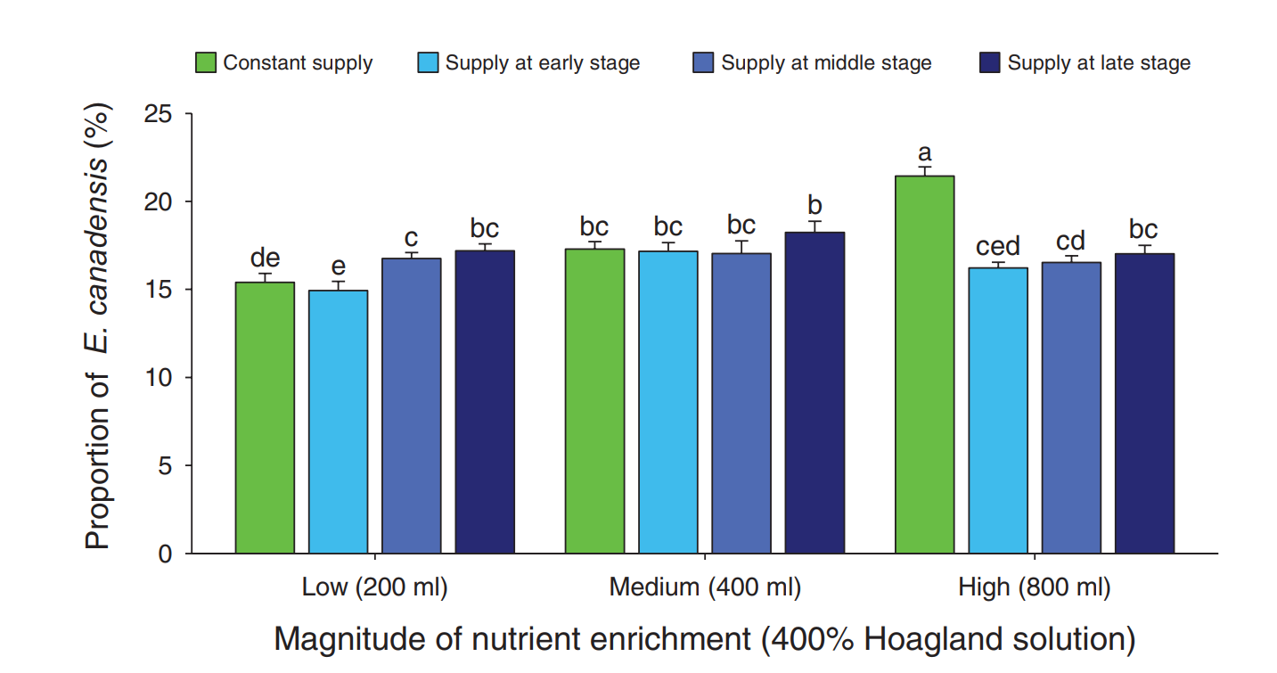 资源脉冲的发生时间和强度影响小蓬草的入侵性(小蓬草生物量占群落生物量的比例)