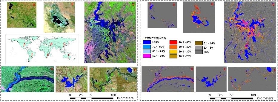 典型区域卫星遥感影像(左)及研究提取的水体淹没频率(右)