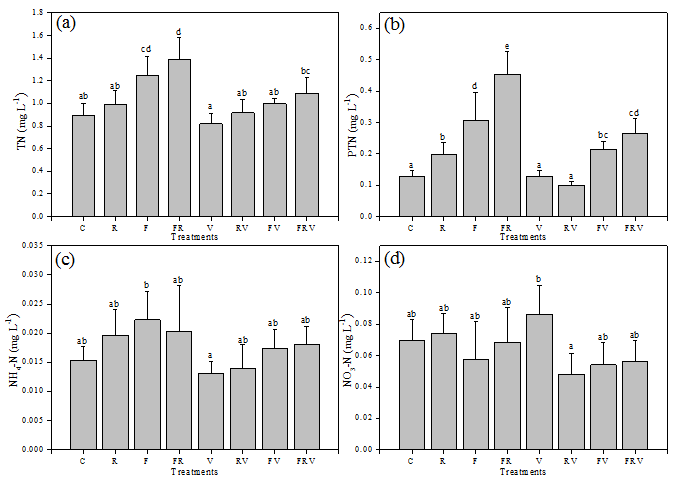 图1 总氮、颗粒性总氮、氨态氮和硝态氮在不同处理中的差异性。小写字母表示多重比较的差异