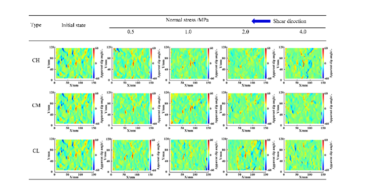 图4 不同强度混凝土-岩石接触面剪切前后3D视倾角退变特征
