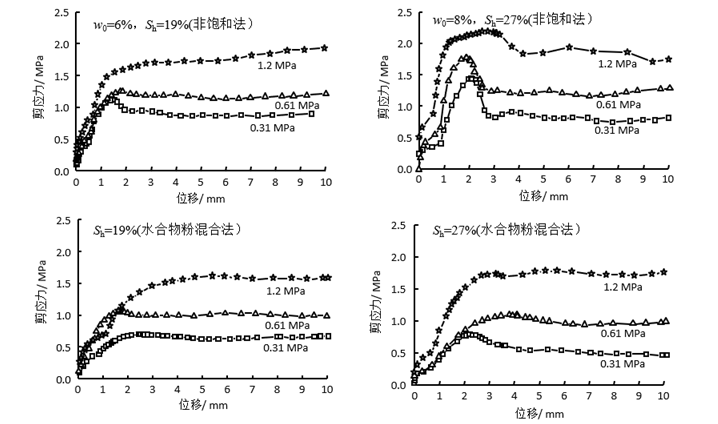 使用合成的水合物粉制备含水合物土进行直剪试验,试验结果表明,与非饱和制样法相比,水合物粉混合法表现出明显的摩擦材料的特性(图2),相同水合物饱和度下,水合物粉混合法制备土样的强度低于非饱和法制备土样的强度。