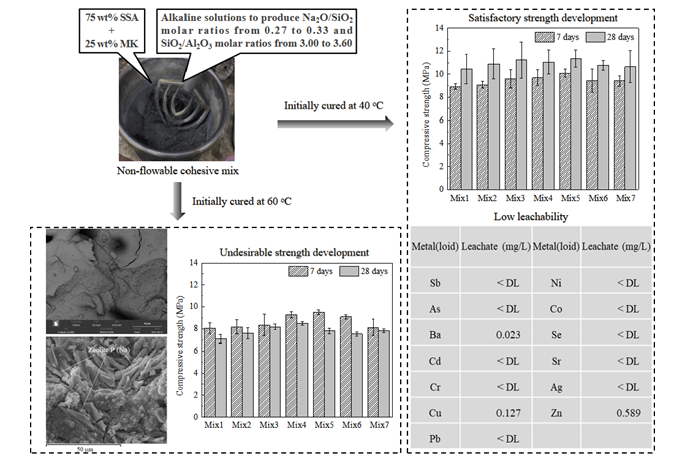 地质聚合物通常是由富含铝硅酸盐的前驱材料与碱性溶液反应合成,合成过程一般包括在腐蚀性环境中从富含铝硅酸盐的前驱材料中溶解出硅和铝,然后将硅和铝离子凝胶化形成单体,继而缩聚形成三维网络结构的地质聚合物。与混凝土材料相比较,地质聚合物表现出更高的强度、耐久性和耐高温性能,具有替代水泥作为可持续土工材料的潜力。污泥焚烧灰是高温焚烧市政污泥而产生的残渣,其资源化利用决定了污泥焚烧技术的可持续发展。