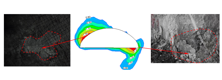 基于该初始地应力综合估计方法获取了双江口水电站地下厂房洞室群的三维初始地应力场,据此开展的围岩脆性破坏预测与实际情况吻合良好(图3)。表明这一初始地应力综合估计方法可为高应力地下工程的开挖支护设计方案优化设计、围岩失稳风险控制提供基础的地应力条件。相关研究成果以封面文章发表于Journal of Rock Mechanics and Geotechnical Engineering。