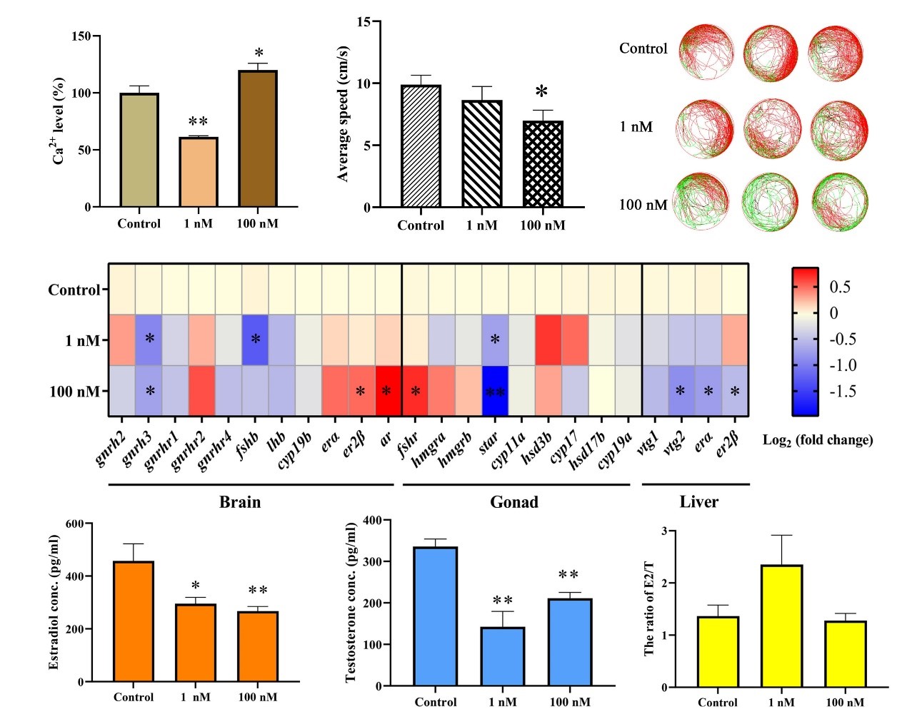 DBDPE对斑马鱼的上述毒性效应得到了进一步验证:(1)斑马鱼脑部胞内钙离子稳态遭到破坏,同时斑马鱼的运动距离和运动速度均显著下降,表明DBDPE可能通过影响钙离子信号通路及肌肉相关蛋白的变化影响肌肉收缩功能,进而引起斑马鱼运动行为发生变化;(2)下丘脑-垂体-性腺-肝脏(HPGL)轴的相关基因的转录水平发生变化,雌激素和睾酮的水平显著下降,表明DBDPE可能通过抑制gnrh3, fshb, star等基因的表达抑制类固醇激素的合成,从而影响卵细胞的发育和受精能力。