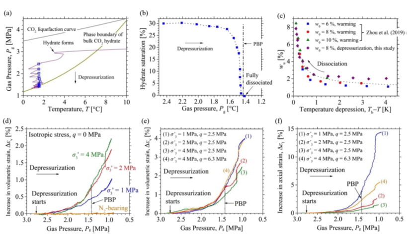 为此,中国科学院武汉岩土力学研究所土动力学团队在孔隙介质化学-力学理论框架基础上,提出了水合物沉积物的广义相平衡理论,可以充分考虑水合物储层中毛细、吸附和盐分对水合物形成条件的影响。根据广义相平衡理论可以推测,水合物沉积物在稳定区内温-压条件发生改变可以导致孔隙水合物的部分分解,进而造成储层的基本物理力学特性的改变;进一步,研究团队利用自行研发的实验设备,进行了不同温-压路径的分解实验和变形监测,证实了水合物在稳定区发生部分分解并导致水合物沉积物变形。长期以来,科技人员通常只关注水合物储层在跨越相平衡线时的分解,没有意识到水合物稳定区内的分解变形。因此,本研究相关成果扩展了对水合物分解变形机理与规律的认识,为水合物资源开采提供更多有效参考。