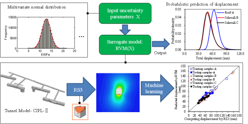 深部地下实验室已成为各学科重大基础性前沿研究的重要实验场所。中国锦屏地下实验室二期(CJPL-Ⅱ)位于中国西南部四川省锦屏山区,深埋2400米,是目前世界上最深的地下实验室(图1)。针对深部岩体的非线性力学行为,中国科学院武汉岩土力学研究所智能岩石力学组科研人员依托CJPL-Ⅱ的B2实验厅,通过长期现场监测,揭示了深部岩体变形、应力、开裂等非线性力学行为,建立了基于多元分布和相关向量机模型的隧洞位移概率预测方法(图2)。研究工作通过多元分布函数建立岩体参数随机变量的统计模型,识别参数间的相关性,综合采用相关向量机(RVM)模型、有限元数值模拟、蒙特卡洛(MCS)方法,估计岩体性质和隧洞位移的不确定性,并根据预测的隧洞位移计算隧洞的可靠度(图3)。在此基础上,采用参数敏感性分析方法,分析了输入岩体参数变异性对输出响应结果的影响,揭示了岩体参数相关性对隧洞位移和可靠度的影响规律(图4)。该方法提供了一种考虑岩体参数变异性与相关性的有效途径,基于相关向量机(RVM)与有限元程序耦合的方法,将不确定性计算方法应用于实际隧洞工程分析中,具有处理高维非线性问题的能力,可以用来描述深部岩体的非线性力学行为。