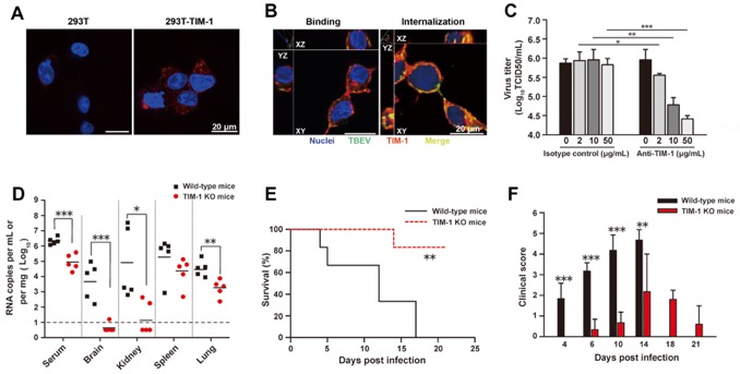 研究人员首先通过病毒结合细胞膜蛋白的质谱分析,筛选出一种能够与TBEV病毒粒子结合的宿主蛋白TIM-1。异位表达TIM-1可显著增强非敏感细胞对TBEV的易感性。通过基因敲除和病毒基因组RNA转染试验,证实了TIM-1在病毒复制周期的侵入阶段发挥作用。TIM-1与病毒粒子可共同内化进入宿主细胞。通过基因敲除、基因敲减、抗体封阻等抑制TIM-1蛋白功能,能够显著抑制病毒感染A549和Vero等细胞。在表达TIM-1的原代肾小管上皮细胞(RTEC)中,拮抗TIM-1也可显著降低病毒的感染水平。