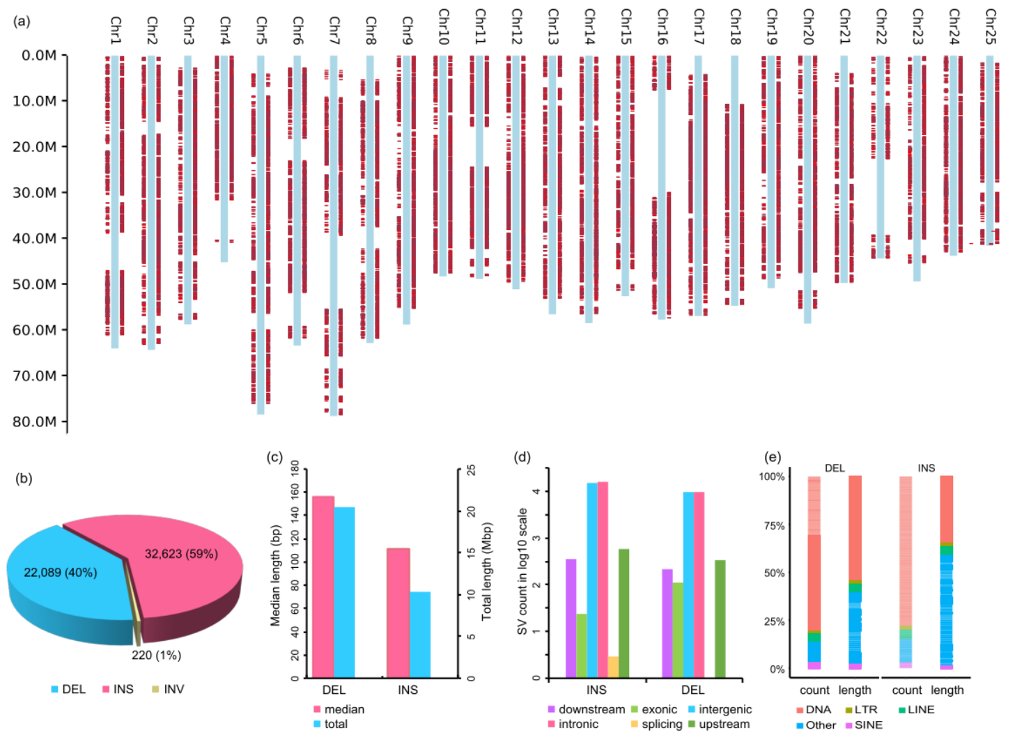 利用构建高质量的AB品系斑马鱼参考基因组与已发表的GRCz11进行比较分析,研究人员鉴定了两个品系之间存在的9029929个SNPs(单核苷酸多态性),2376812个InDels(小片段序列的插入或者删除),54932个SVs(结构变异),其中包括32623个插入,22089个删除和220个序列倒置,这些变异是揭示两个品系斑马鱼之间遗传差异的资源。