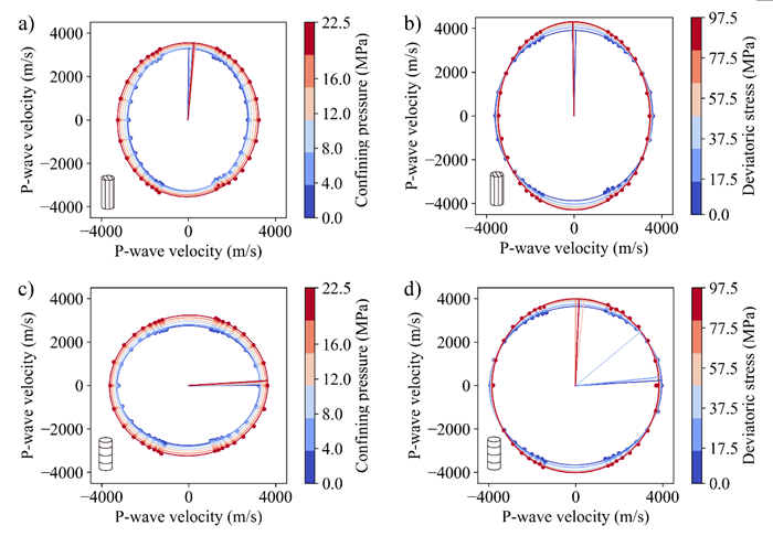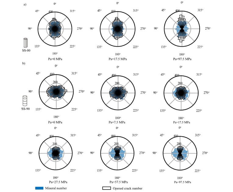 在传统的室内岩石物理实验中,很难连续观测不同应力条件下岩石的微观结构特征。基于此,中国科学院武汉岩土力学研究所二氧化碳地质封存研究团队通过基于离散元的数值分析方法模拟了层理平行/垂直与最大主应力的砂岩在不同应力条件下P波波速变化过程,并基于椭圆拟合方法分析了波速各向异性参数(图2),从而揭示了波速应力敏感性的微观机理:微裂纹的应力敏感性是波速各向异性变化的主要原因。围压作用下,微裂纹闭合,其数量减小是波速各向异性减弱的原因(图3);偏应力作用下,微裂纹平行于最大主应力方向的微裂纹张开,垂直方向的微裂纹闭合。因此,对于层理与最大主应力方向平行的砂岩,即使偏应力作用下微裂纹数量在减小,微裂纹的各向异性也会增强。而层理与最大主应力方向垂直的砂岩,在持续偏应力作用下,波速各向异性先减小再增大,波速各向异性方向在应力诱导下发生转向。由于矿物的排列难以受应力影响而改变,从而影响波速各向异性转向过程,因此波速各向异性转向滞后于微裂纹各向异性转向。
