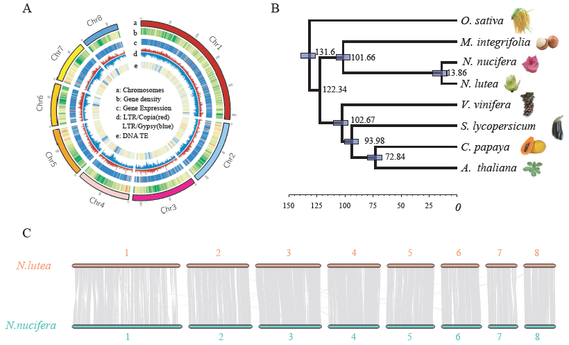 图1 美洲黄莲基因组的序列特征及与亚洲莲基因组的共线性比较。(A)美洲黄莲的基因组特征。(B)植物系统发育树推测美洲黄莲与亚洲莲的分化时间。(C)美洲黄莲与亚洲莲基因组的共线性比较。