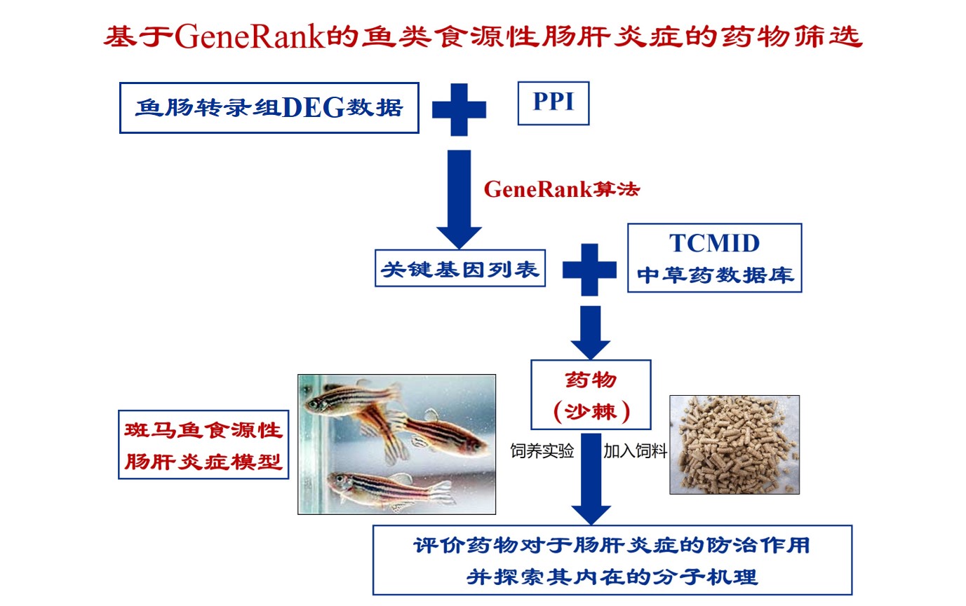 中国科学院水生生物研究所水体生物信息学学科组研究人员,基于已在Frontiers in Physiology杂志上发表的草鱼 SBMIE 肠肝转录组数据,通过TCMID(Traditional Chinese Medicines Integrated Database)来预测对肠肝炎症有效的药物。该预测方法是基于差异基因的表达量(DEG),结合蛋白互作网络(PPI),使用 GeneRank 算法对目标基因,按照其重要性排序,来选取排列靠前的 300 个基因作为关键基因,以构建关键基因列表;再将关键基因相应的靶标化合物,匹配到 TCMID 数据库,得到含有相应草本成分较多的中药;然后,基于中药的活性成分及其药理筛选到治疗肠炎的潜在药物——沙棘(Hippophae rhamnoides L.)。根据以上的鱼类肠肝炎症的药物预测结果,将沙棘添加入饲料,在斑马鱼食源性肠炎模型(SBMIE)模型中(已获专利授权),对其抗肠肝炎症的效果进行评价,运用免疫基因表达分析、免疫细胞成像、病理及生长评价、多组学分析(转录组和微生物组)等方法,揭示了沙棘的抗肠肝炎症的分子免疫机理。