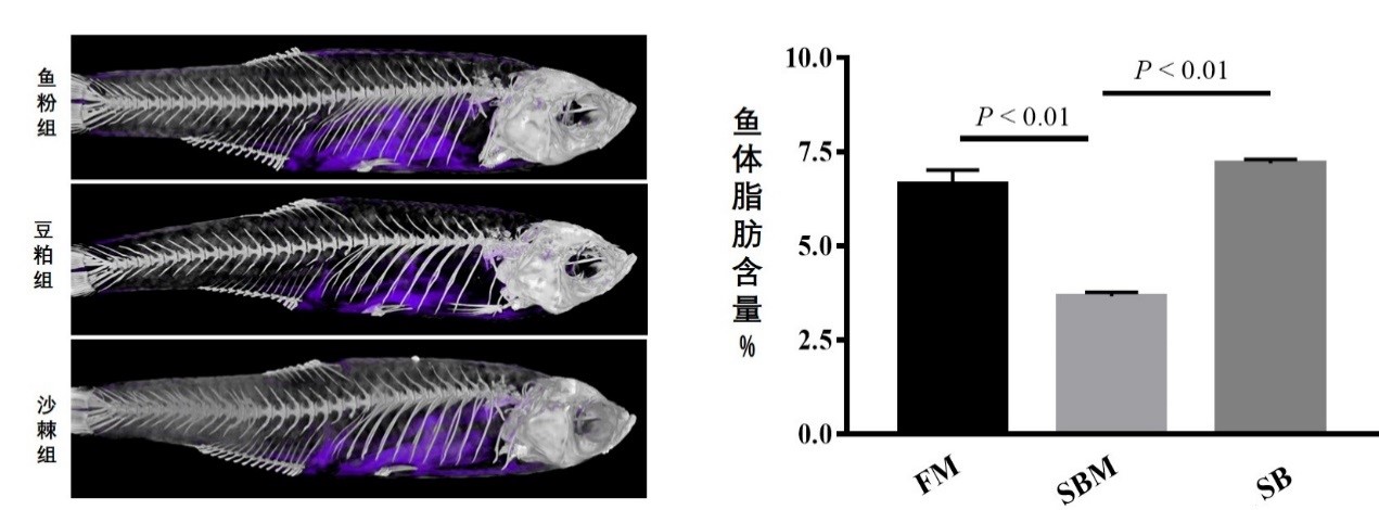 图2 micro-CT测定实验鱼的总脂肪含量(脂肪组织标为紫色;FM:鱼粉组, SBM:豆粕组, SB:沙棘组)