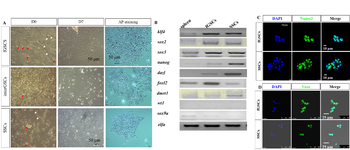 中国科学院水生生物研究所孙玉华研究员团队从黄鳝的卵巢、间性性腺和精巢中分离培养出生殖干细胞,经研究发现,GSCs存在于不同发育时期的黄鳝性腺中。通过特殊的方法和培养基,科研人员成功富集培养出雌雄生殖干细胞(fGSCs)、间性生殖干细胞(interGSCs)和雄性生殖干细胞(SSCs)。有趣的是interGSCs事实上是一群混合型的生殖干细胞,里面同时包含fGSCs和SSCs。进一步对分离的GSCs进行定性分析,发现分离培养的GSCs都表达干细胞的特征,包括形成典型的干细胞克隆、碱性磷酸酶阳性和高表达生殖干细胞特异性基因和蛋白。