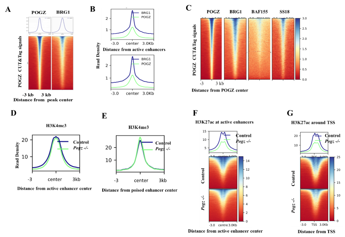全基因组结合分析发现,POGZ显著定位于基因的启动子和增强子区域(图3)。 进一步研究发现,POGZ可以与SWI-SNF (esBAF)染色质重塑复合物的核心组分BRG1/BAF155互作(图4),并且在基因的启动子和增强子区域共定位。