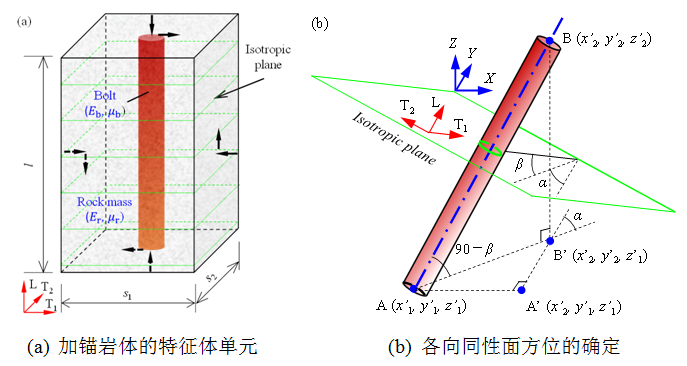 为有效模拟全长注浆锚杆对深部围岩的加固效应,武汉岩土力学研究所智能岩石力学研究团队提出了将弹塑性力学、复合材料力学、解析方法与数值分析相结合的局部均一化方法。在该局部均一化法中,基于锚杆单元法所采用的原始网格模型,建立了全长粘接锚杆加固岩体的特征体单元。该特征体单元为单元体中心包含一根锚杆的直四棱柱,其横截面尺寸等于锚杆间距,长度等于锚杆长度。通过局部均一化方法将该特征体单元从单向锚杆增强复合材料均一化为横观各向同性介质,其力学特性由一个新的横观各向同性弹塑性模型予以描述。特征体单元的局部均一化法参数则采用解析方法、复合材料力学,由已知的岩体和锚杆参数求得。利用该局部均一化法,对已有文献中加锚岩体的物理模型试验和锦屏二级2#引水隧洞的全长粘接锚杆加固效应进行模拟。研究结果表明:相比结构单元法,局部均一化法的模拟结果与加锚岩样的物理模型试验结果更加吻合,并能给出更反映深部地下洞室加锚围岩力学响应的预测结果;即使采用地下工程中常用直径和间距的全长粘接锚杆,也可在锚杆轴线方向上大幅提高围岩的弹性模量、抗剪强度和抗拉强度。