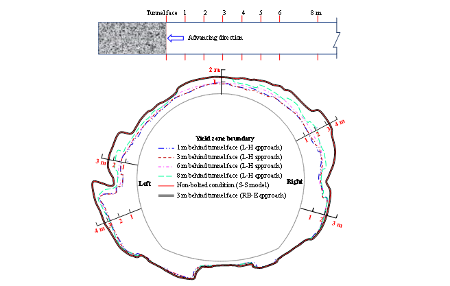 图4.不同锚杆支护时机下的锦屏二级2#引水隧洞典型剖面屈服区边界