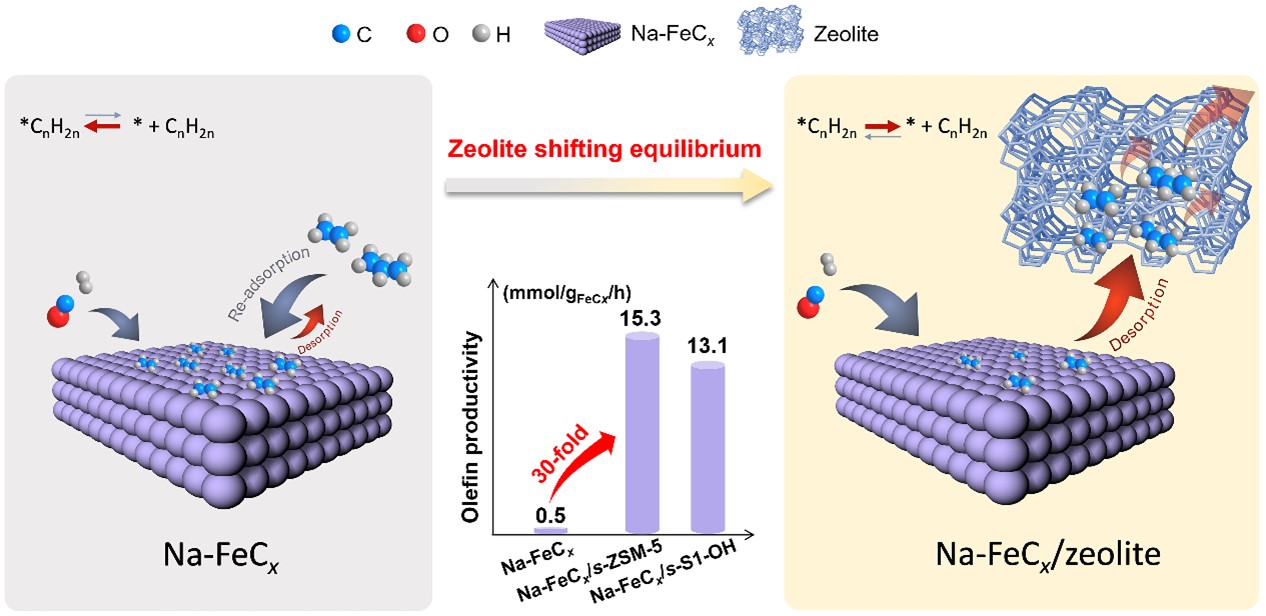 研究团队通过混合适当的分子筛材料使得Na-FeCx催化剂在FTO过程中展现出高效的低温催化活性,并且优化了产物分布。本工作报道的碳化铁和分子筛复合催化体系和以往文献报道的金属/金属氧化物+分子筛体系有本质的区别。实验数据和理论研究表明,分子筛并不是作为酸催化剂,而是改变了烯烃分子在碳化铁表面的解吸-再吸附平衡,合理控制分子筛的形貌和孔道环境可以加快烯烃分子从Na-FeCx表面脱附,这一特性有利于合成气在Na-FeCx表面持续高效地进行。本工作提出的催化剂体系将为合成气转化过程提供新的多相催化剂设计思路。